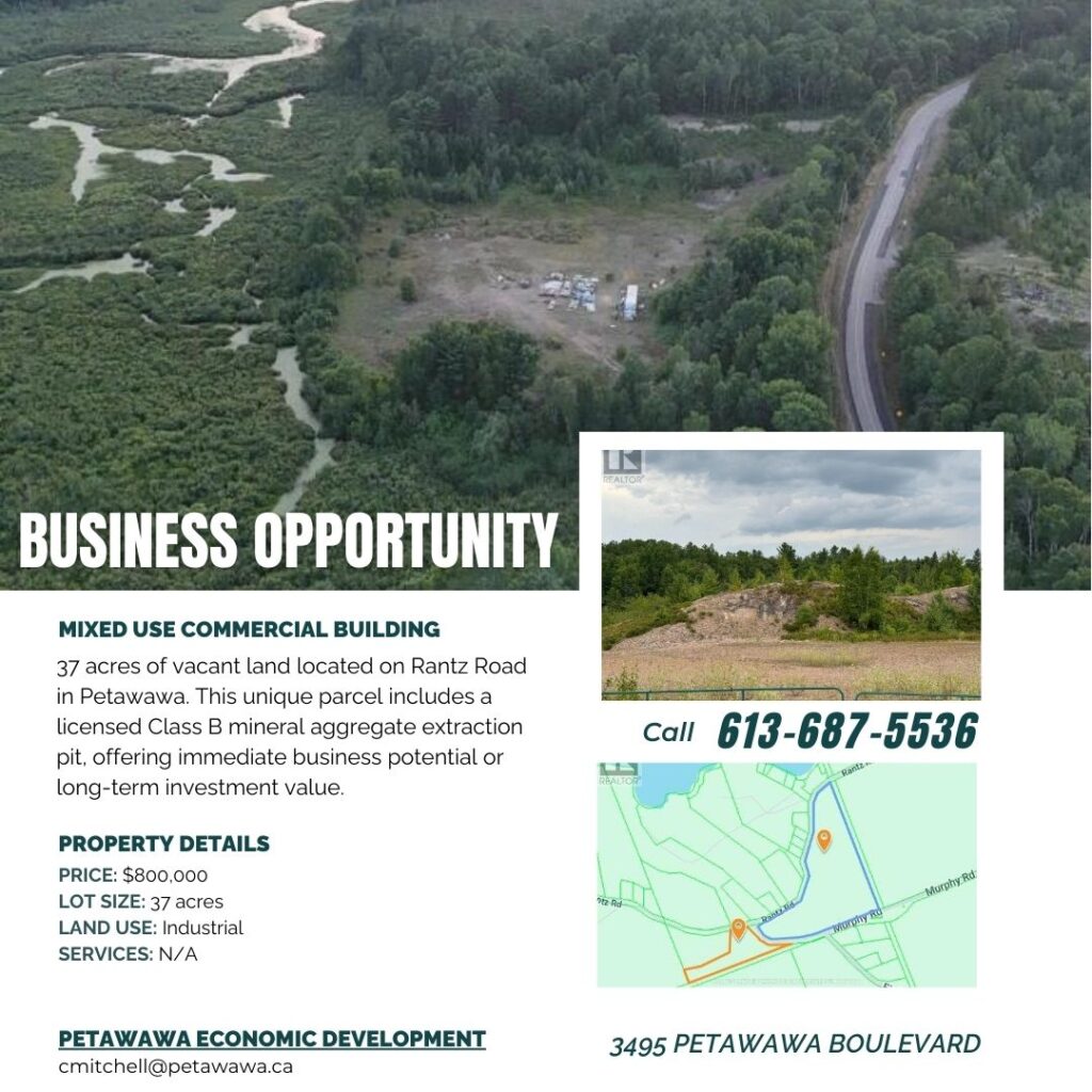37 acres of vacant land located on Rantz Road in Petawawa, Ontario. The seller indicates this parcel includes a licensed Class B mineral aggregate extraction pit. Conveniently situated just minutes from Garrison Petawawa and Highway 17.