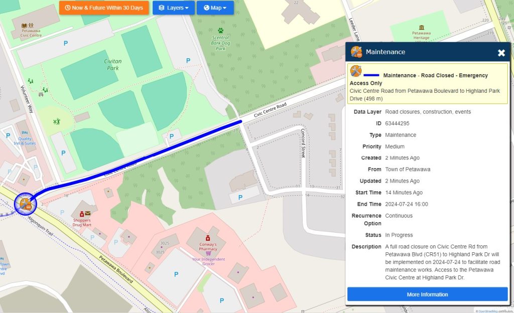 Civic Centre Road is closed today (July 24th) from Petawawa Boulevard to Highland Park Drive to facilitate road maintenance works. Access to the Petawawa Civic Centre is available from Highland Park Drive (through the dog park parking lot) and from Volunteer Way via Dundonald Drive.